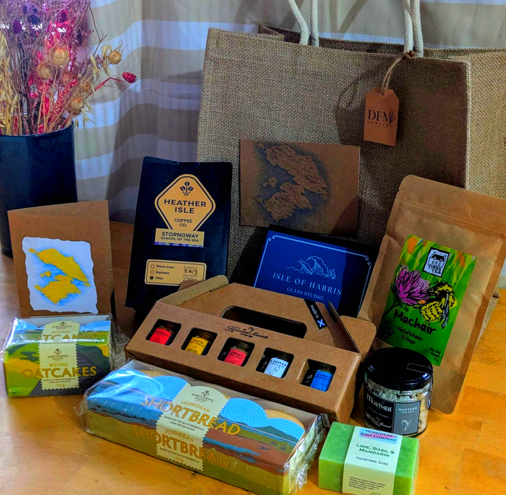 Discover our exclusive selection of hampers filled with authentic locally made products from the Hebrides, perfect for any gift or special occasion.